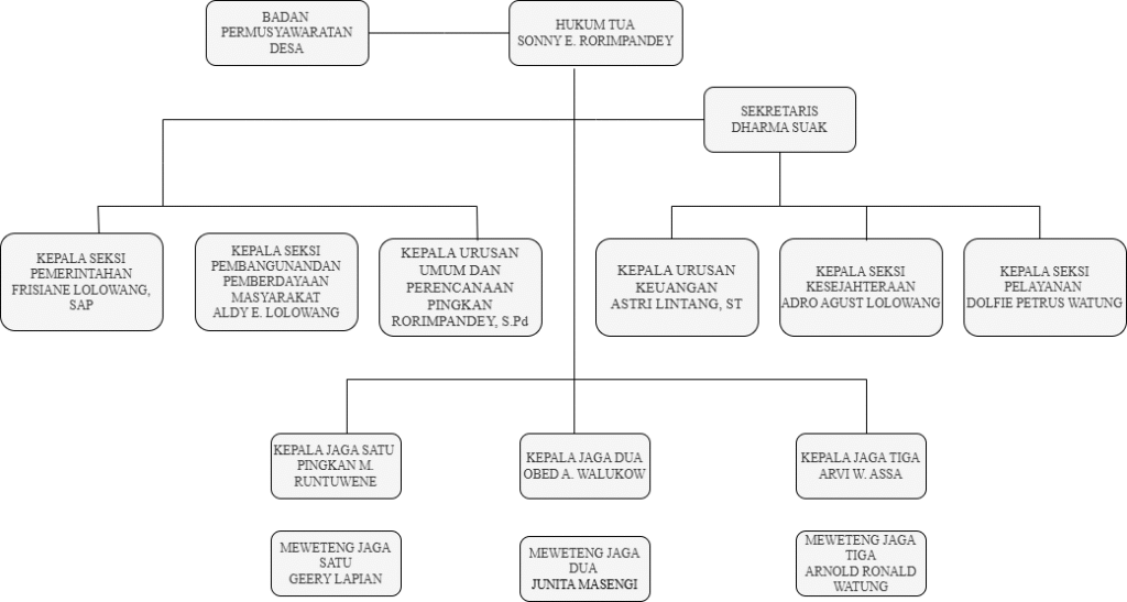 Struktur Organisasi Pemerintahan Desa Tahun 2025 Sonny Edwin RorimpandeyHUKUM TUA Dharma Mesri SuakSekretaris Desa Frisiane Jaine LolowangKepala Seksi Pemerintahan Adri Agust LolowangKepala Seksi Kesejahteraan Annabel Petrus WatungKepala Seksi Pelayanan Pingkan RorimpandeyKepala Urusan Tata Usaha dan Umum ALDY E. LOLOWANGKEPALA SEKSI PEMBANGUNAN DAN PEMBERDAYAAN MASYARAKAT Astri Christy LintangKepala Urusan Keuangan Pingkan Marce RuntuweneKepala Jaga 1 Obed Albert WalukowKepala Jaga 2 Arvi Weldri Yulian AssaKepala Jaga 3 Arvi Weldri Yulian AssaKepala Jaga 3 Arvi Weldri Yulian AssaKepala Jaga 3 Arvi Weldri Yulian AssaKepala Jaga 3